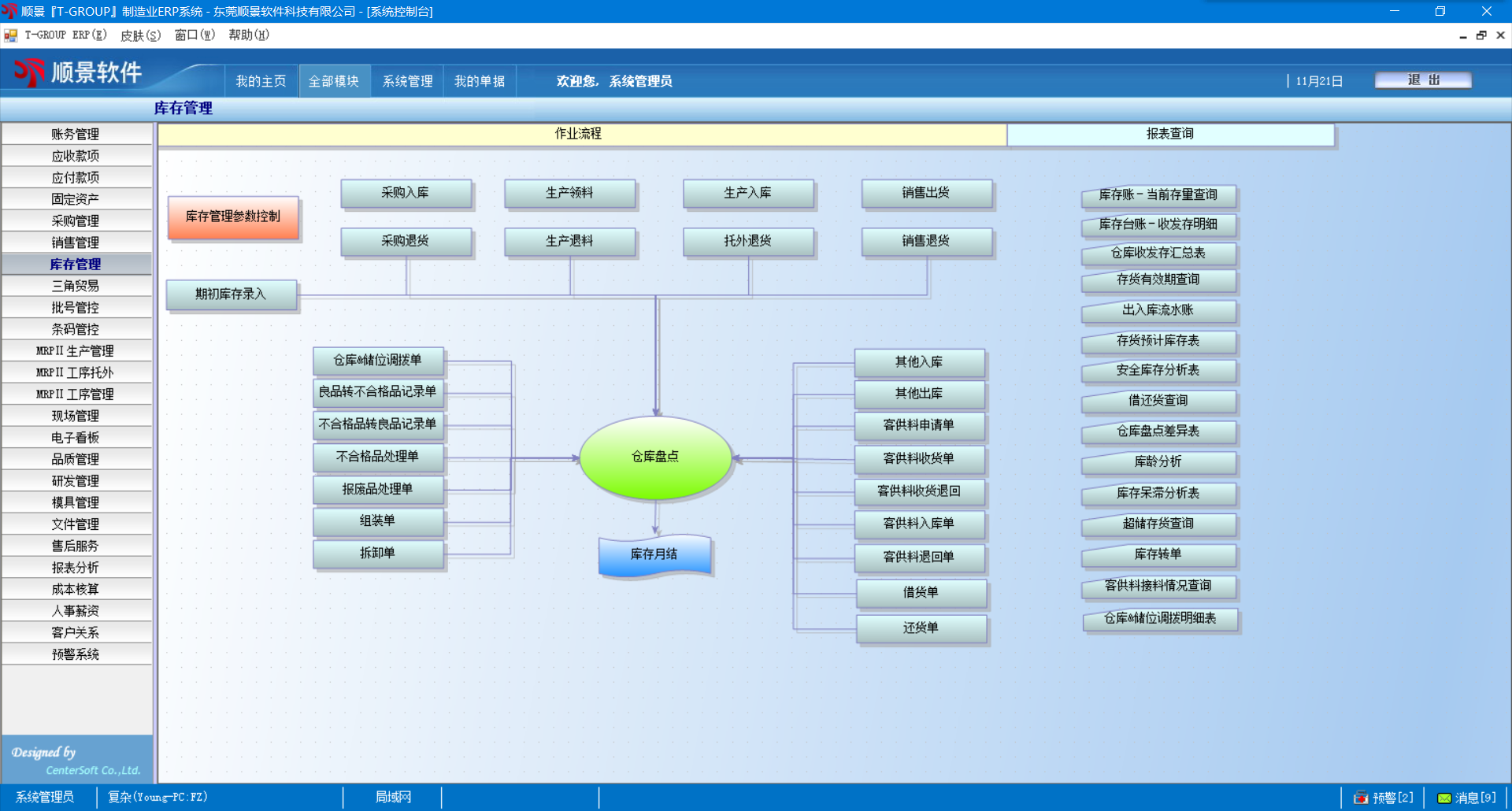 3. 存货盘点管理﹐可依仓库﹑储位﹑批号进行盘点,可进行盘点明细表,盘点卡打印;